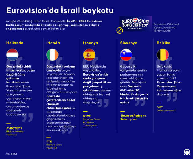 Açıklamada, "AVROTROS, 12 Eylül 2025'te, Gazze'deki ciddi insani acıların, basın özgürlüğüne getirilen kısıtlamaların ve Eurovision Şarkı Yarışması'nın son edisyonunu çevreleyen siyasi müdahalelerin, savunduğumuz değerlerle bağdaşmadığını belirtmiştir." denildi.