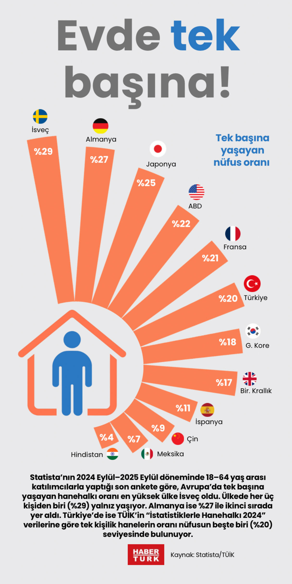 Statista'nın 2024 Eylül–2025 Eylül döneminde 18–64 yaş arası katılımcılarla yaptığı son ankete göre, Avrupa'da tek başına yaşayan hanehalkı oranı en yüksek ülke İsveç oldu. Ülkede her üç kişiden biri (%29) yalnız yaşıyor. Almanya ise %27 ile ikinci sırada yer aldı. Türkiye'de ise TÜİK'in "İstatistiklerle Hanehalkı 2024" verilerine göre tek kişilik hanelerin oranı nüfusun beşte biri (%20) seviyesinde bulunuyor.