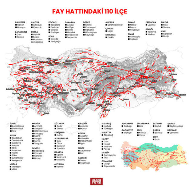 Türkiye 6 Şubat tarihinde güne deprem ile uyandı. Tüm yurtta Kahramanmaraş merkezli depremin etkisi devam ederken hasarın boyutu giderek artıyor. İki büyük depremin ardından deprem endişesi taşıyan kişiler tarafından diri fay hatları ve fay hatları üzerinden geçen iller ile ilçeler gündeme geldi. İTÜ'lü yerbilimci Prof. Dr. Okan Tüysüz, Türkiye'de fay hatları üzerinde yer alan iller ve ilçeler hakkında Habertürk'ten Alper Uruş'a konuştu. İşte konuyla ilgili uzman isimden gelen açıklamalar ile fay hattı üzerinden geçen illerin listesi...