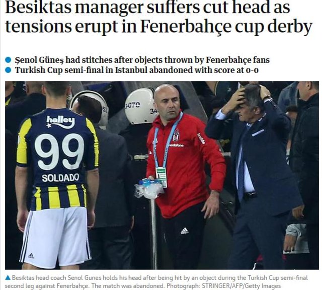 The Guardian'da derbiyi Şenol Güneş'in yaralanması üzerinden gördü. Fenerbahçe taraftarlarının attığı yabancı maddeye vurgu yapan gazete, maçın 0-0'lık skorla devam ettiği sürede yarıda kaldığını dile getirdi.