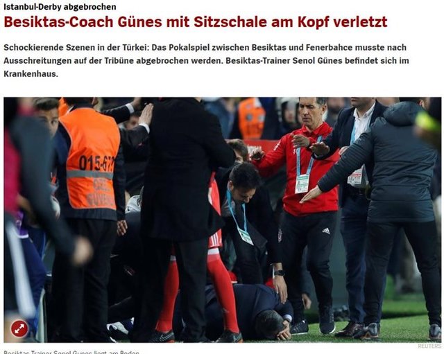 Der Spiegel ise Beşiktaş Teknik Direktörü Şenol Güneş'in koltukla başından yaralandığını başlığa taşırken "Türkiye'de şok eden görüntüler! Beşiktaş ile Fenerbahçe arasındaki derbi, tribün olayları nedeniyle iptal edildi. Beşiktaş Teknik Direktörü Şenol Güneş, hastaneye kaldırıldı." ifadelerine yer verdi.