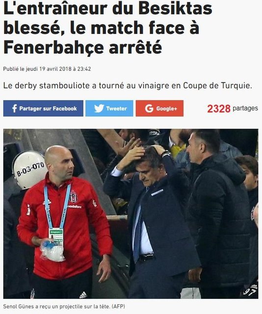 Fransa'nın L'Equipe gazetesi de derbiyi, Şenol Güneş'in başına isabet eden madde nedeniyle yarıda kalmasından gördü.