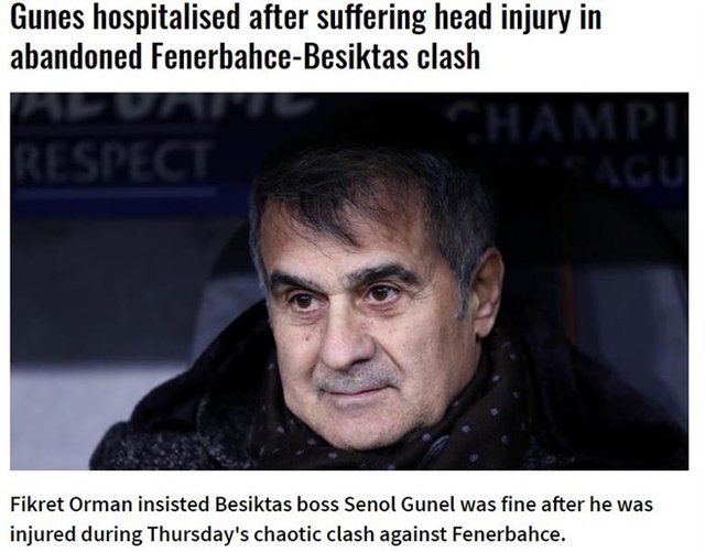 FourFourTwo, Şenol Güneş'in hastaneye kaldırıldığını, yabancı maddeler nedeniyle Fenerbahçe maçının yarıda kaldığını başlığa çekti. Haberde Fikret Orman'ın Şenol Güneş'in iyi olduğunu dile getirdiği haber de belirtilirken derbinin kaotik olduğu vurgulandı.