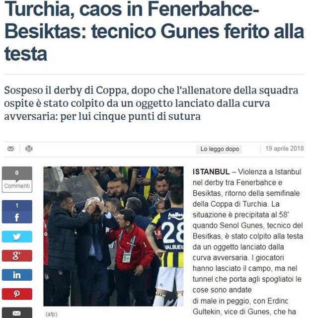İtalya'daki La Repubblica, "Fenerbahçe-Beşiktaş maçında kaos: Teknik direktör Şenol Güneş kafasından yaralandı" başlığını attı.