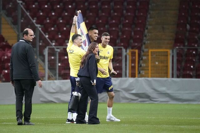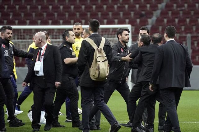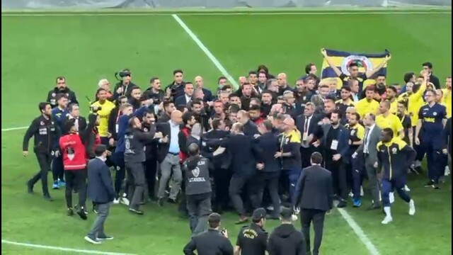 Futbolculardan İrfan Can Eğribayat ve Mert Hakan Yandaş sahanın ortasında ellerindeki Fenerbahçe bayrağını havaya kaldırırken, o esnada yan taraflarında arbede yaşandı.