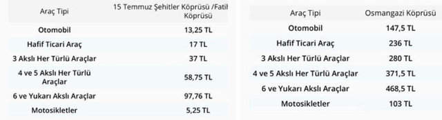 FSM Köprüsü, Osmangazi Köprüsü, Yavuz Sultan Selim Köprüsü ve Avrasya Tüneli gidiş geliş ücreti ne kadar oldu?