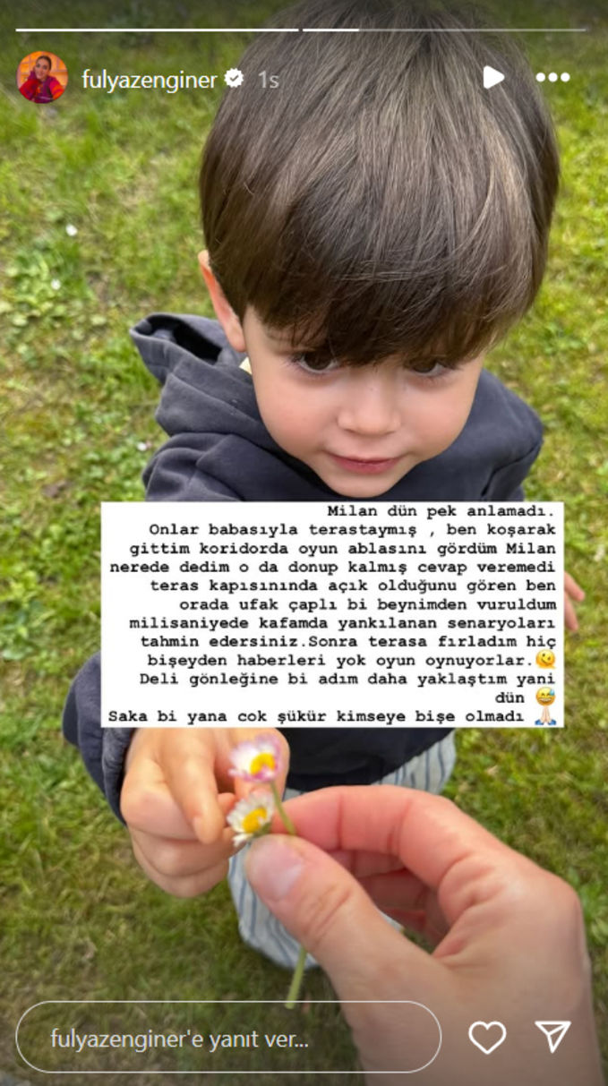 Fulya Zenginer, bu konuda şunları söyledi; "Milan dün olanları pek fark etmedi. Onlar babasıyla terastaydı, ben koşarak içeri girdim. Koridorda oyun ablasını gördüm ve 'Milan nerede?' diye sordum. O da şaşkın bir şekilde donup kaldı, cevap veremedi. Teras kapısının da açık olduğunu görünce, o an beynimden vurulmuşa döndüm; saniyeler içinde aklımda beliren kötü senaryoları tahmin edebilirsiniz. Hemen terasa fırladım, baktım ki onlar hiçbir şeyden habersiz oyun oynuyorlar. Dün, deli gibi endişelenmeye bir adım daha yaklaştım yani. Şaka bir yana, çok şükür kimseye bir şey olmadı."