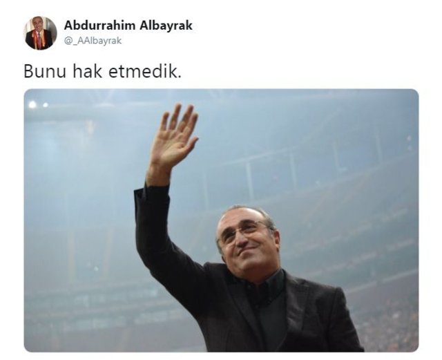 Galatasaray İkinci Başkanı Abdurrahim Albayrak, idari yönden ibra edilmemelerine sosyal medyadan tepki gösterdi. Albayrak, "Bunu hak etmedik" diye tweet attı.