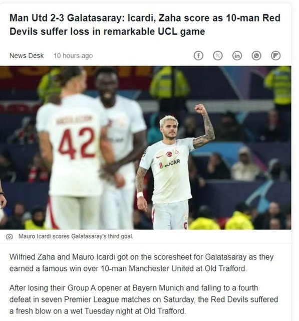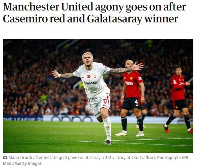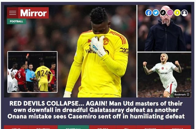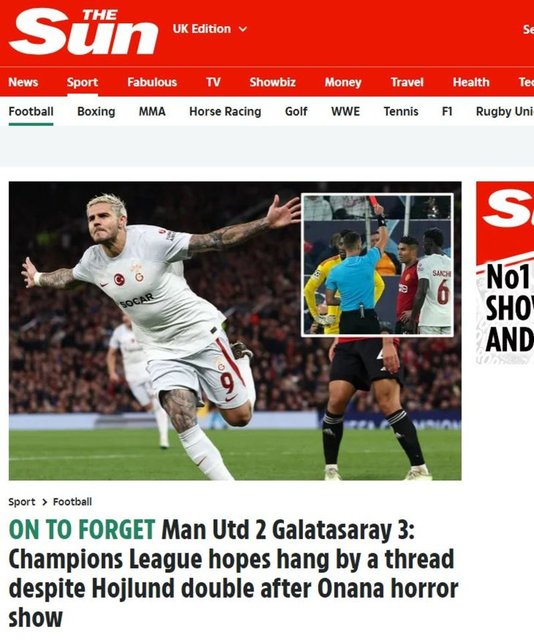 Galatasaray'ın Old Trafford'da Manchester United'a karşı elde ettiği 3-2'lik zafer, İngiliz basınında geniş yankı uyandırdı. Galatasaray'ın performansını öven Ada basını, başta kaleci Andre Onana olmak üzere Manchester United'ı ise ağır şekilde eleştirdi.
