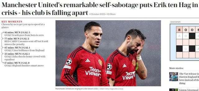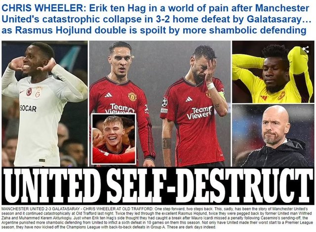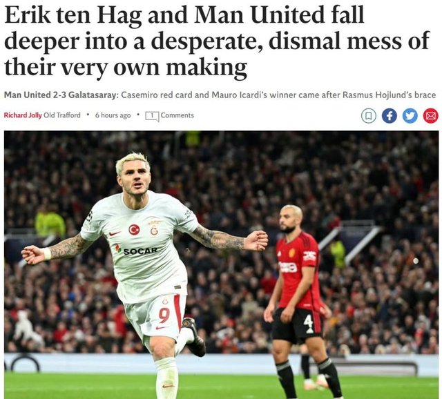 Independent: Manchester United için tam anlamıyla kâbus dolu bir gece oldu.. Erik Ten Hag ve futbolcular kendi yarattıkları umutsuz karmaşanın derinliklerinde. Otuz yıl önce Manchester United İstanbul'da Galatasaray tarafından 'Cehenneme hoş geldiniz' (Welcome to Hell) sloganıyla karşılanmıştı. Otuz yıl sonra United cehennemi buldu: İstanbul'da değil, Manchester'da.