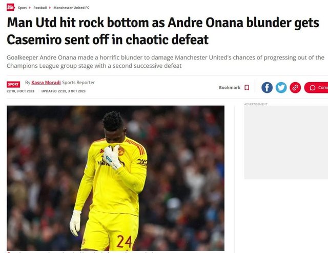 Daily Star: Onana'nın hatası sonrası Casemiro'nun atılmasıyla kaotik bir yenilgiye uğrayan ManU dibe vurdu.