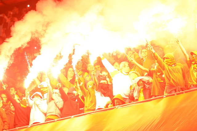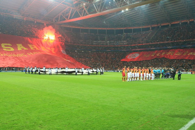 Galatasaray taraftarı dört bir tribünde birden yaktıkları meşalelerle Ali Sami Yen Spor Kompleksi'ni yine 'cehenneme' çevirirken İngilizlerin gündemi de bu akşam oynanacak atmosfer oldu.