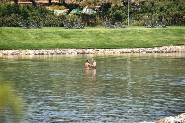 Suyun içinde açma germe hareketleri yapan İmirzalıoğlu, bir ara arkadaşıyla güreşmek istedi. Sonrasında da sarılarak gülüştü.
