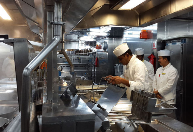 182 kişinin çalıştığı dev mutfakta içinde insan girebilen dev fırınlarda yolculara 24 saat aralıksız yiyecek ve içecek hazırlanarak servis ediliyor.