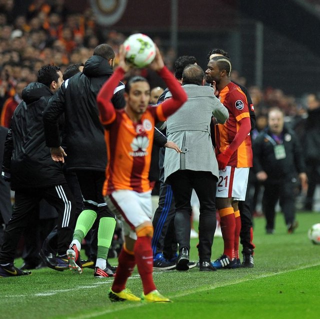 Kamerunlu savunma oyuncusu topa sert bir şekilde vurarak meşin yuvarlağı oyun alanının dışına gönderirken, daha sonra Başakşehir yedek kulübesine giderek Erol Bulut'un üzerine yürdü.