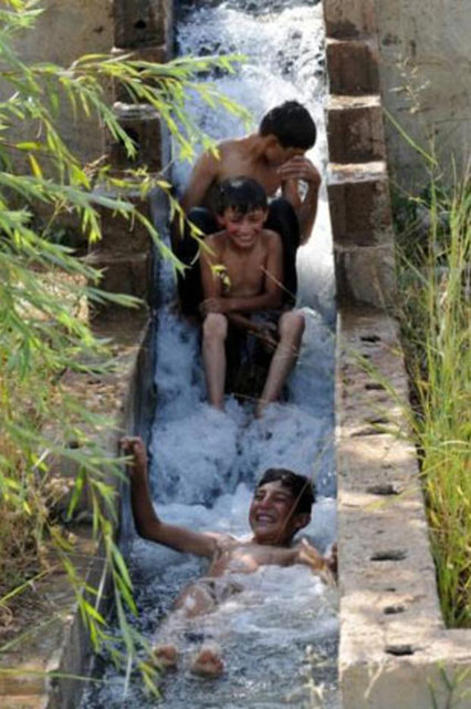 Akşam için hazırlıklara başlamaları nedeniyle deniz veya havuza gidecek zamanları olmayan çalışanlar, hortumla serinlemeyi seçti.
