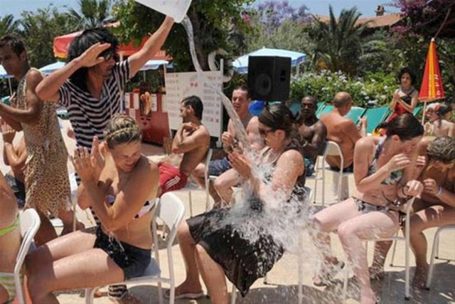 Birbirlerine tuttukları hortumla serinleyen bar çalışanları, fırça ve sıvı sabunla yıkanmaya başlayınca, kendilerini izleyen tatilci ve turistleri gülümsetti.