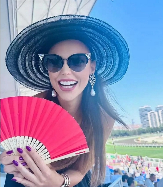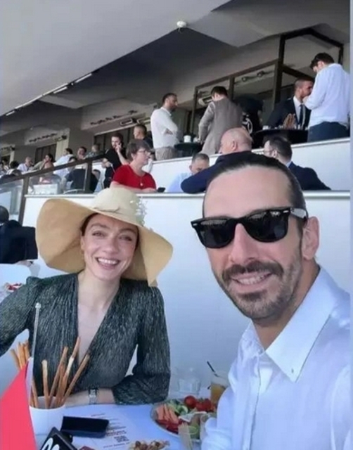 Ünlü çift, tribünde koşuyu izledikleri an poz verdi.