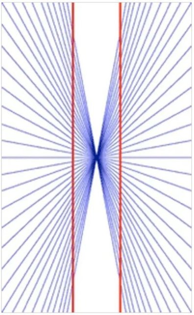 İki kırmızı çizgi dışa doğru eğimli gibi görünse de tamamen düz ve paraleldir. Bu optik yanılsama, bozulmanın kesişme noktalarındaki açıları fazla tahmin eden zihinden kaynaklandığına inanan bir Alman fizyolog olan Ewald Hering'e atfedilir.