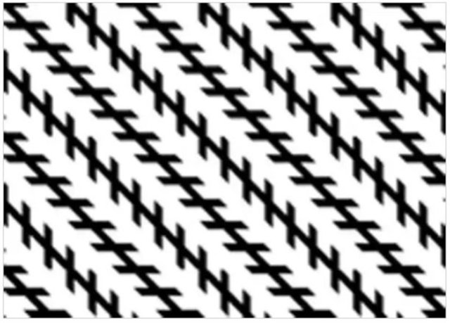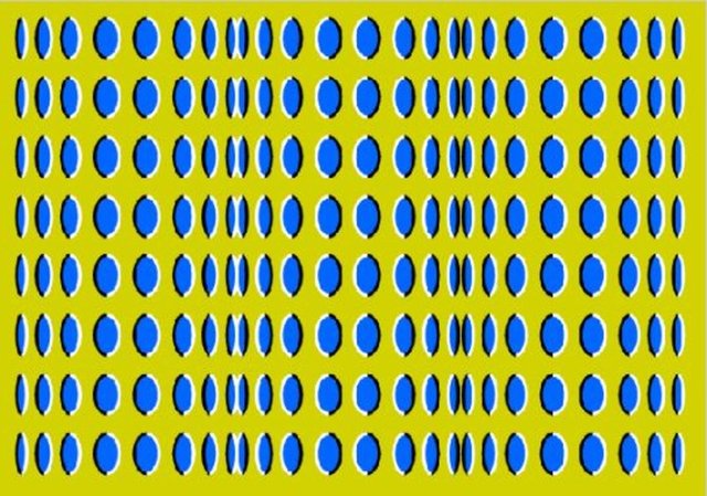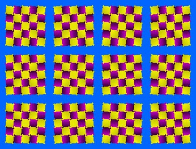 Hayır, bu bir optik illüzyon GIF değil. Görüntü gerçekten statiktir. Herhangi bir noktaya tam olarak baktığınızda hareket etmeyi durduracağına dikkat edin. Bu güçlü optik yanılsama, görüntü içindeki etkileşimli renk kontrastlarından ve şekil konumlarından elde edilir.