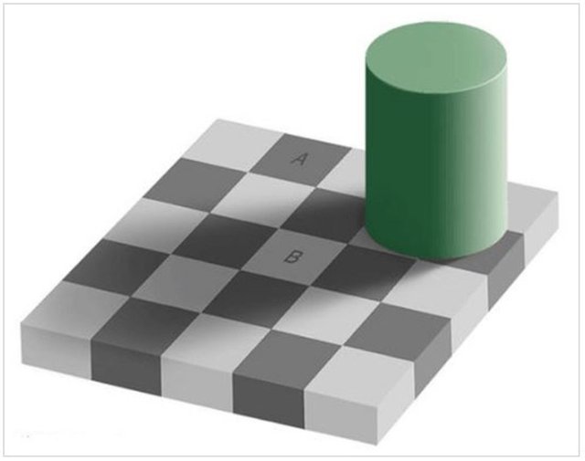 Muhtemelen oradaki en inanılmaz illüzyonlardan birisi de MIT'de profesör olan Edward Adelson tarafından yayınlanan ilk optik illüzyon resimleriydi. “A” etiketli kare, “B” etiketli kareden daha koyu görünse de, aslında tamamen aynı gri tonudur.
