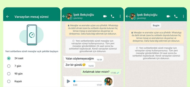 Whatsapp'taki bir diğer gizlilik özelliği ise kaybolan mesajlar. Bu özellikte, mesajların kaç saat süreyle geçmişte kalacağı seçilebiliyor. Tercihe göre 24 saat, 7 gün ve 90 gün süre sonra tüm mesaj geçmişi otomatik olarak siliniyor.