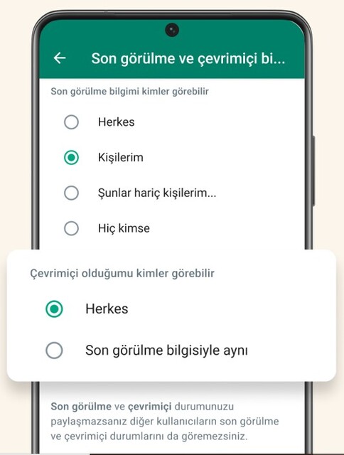 Ancak Whatsapp buna da el attı. Çevrim içi bilgisi özelliği de kişiselleştirildi. Yeni güncelleme ile kullanıcı, yalnızca seçtiği kişilere çevrim içi gözükebiliyor, seçilmeyen diğer kişiler ise hesap sahibini çevrim dışı olarak görüyor.