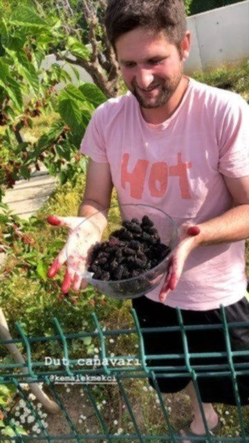 Bahçesinden dut toplayan eşi Kemal Ekmekçi'nin pozunu sosyal medya hesabından "Dut canavarı." notuyla yayınladı.