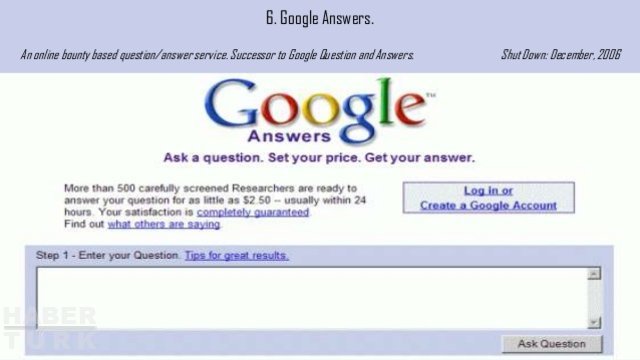 İsminden de anlaşılacağı üzere soru cevap projesi olan Google Answers, Amerikan devinin soru başına ücret talep etmesi sonucunda hüsranla sonuçlandı.