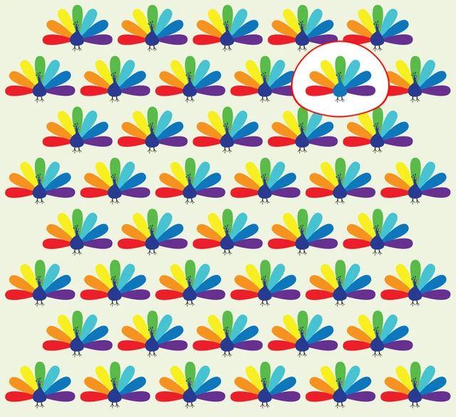 Cevap: Sağ üste yakın yerde bulunan tavus kuşunun gövdesi açık mavi renkte olduğundan farklı olan odur. Diğer tavus kuşlarının gövdesi lacivert rengindedir.