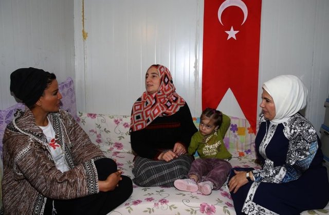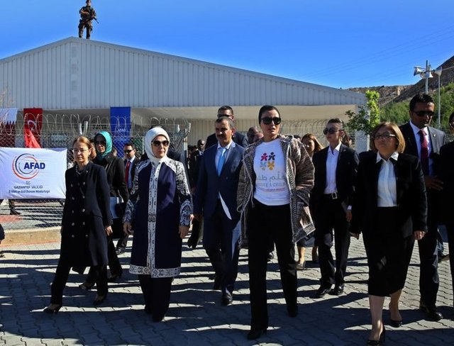 İlçedeki Suriyelilerin barındığı konteyner kentte AFAD İl Başkanı Sinan Atakan'dan brifing alan heyet, daha sonra meslek kurslarının verildiği merkeze geçti. Kursiyerler, burada Emine Erdoğan ve Moza'ya el işi hediyeler sundu. Ülkesinde yaşadıklarını anlatan Suriyeli bir kadını dinleyen Erdoğan'ın, duygulandığı gözlendi.