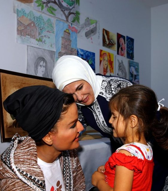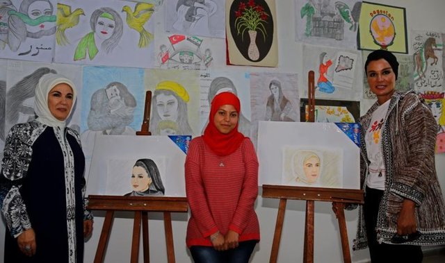 Heyet daha sonra Suriyeli sığınmacıların yaptığı resimlerden oluşan sergiyi gezdi. Cumhurbaşkanı Recep Tayyip Erdoğan'ın resmedildiği tablolar, Emine Erdoğan'a hediye edildi. Suriyeliler, Moza ve Erdoğan'a kara kalem çalışmalardan oluşan resimlerden takdim etti. Suriyeli bir ailenin kaldığı konteyneri de ziyaret eden heyet, sorunları dinledi, çocukların eğitim gördüğü okulda incelemelerde bulundu.