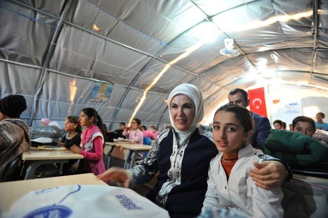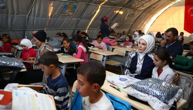 Burada çiçek ve şarkılarla karşılanan Erdoğan ve Moza, bir süre Suriyeli çocuklarla aynı sıraları paylaştı. Sığınmacıların kaldığı çadır kentte de incelemelerde bulunan heyet, çocuklara çeşitli hediyeler verdi.