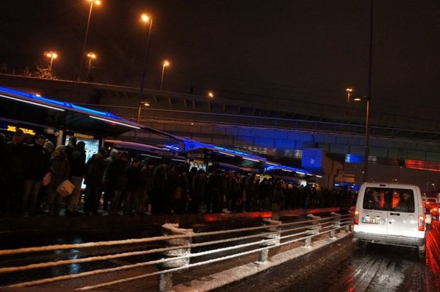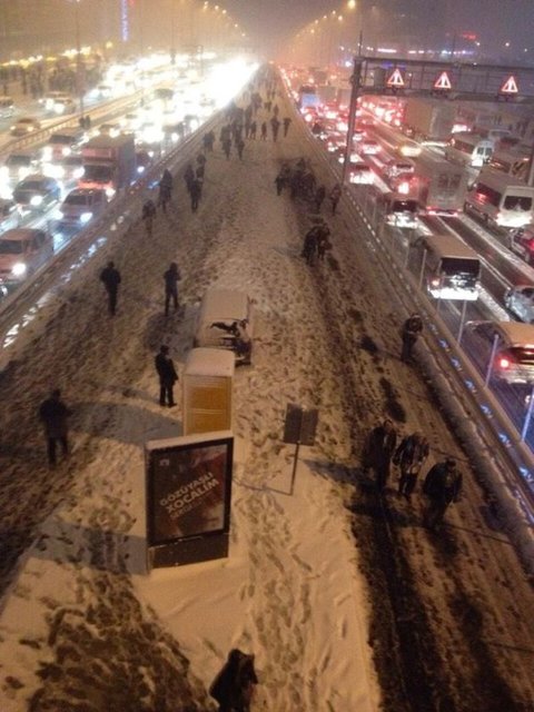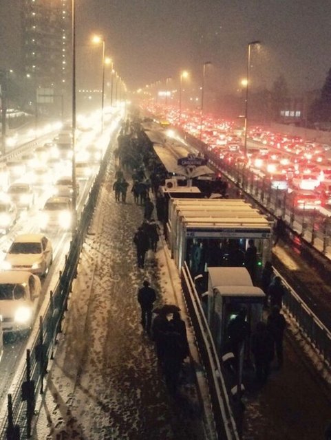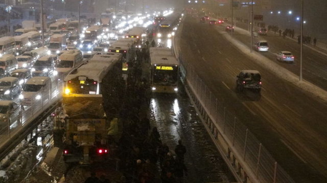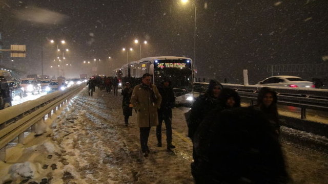 İstanbul'da dün sabah başlayan kar yağışı akşam saatlerinde etkisini artırarak devam ediyor. Şehir içinde görüş mesafesinin azalmasıyla E-5 karayolu ve TEM otoyolu başta olmak üzere ana arterlerdeki trafik, zaman zaman durma noktasına geldi. Buzlanma nedeniyle yer yer trafik kazaları meydana geldi. Haramidere'de bir metrobüsün yoldan çıkması seferleri bir süre durdurdu. Vatandaşlar yürümek zorunda kaldı. Yoldan geçen araçlar ise vatandaşları arabalarına alıyor.