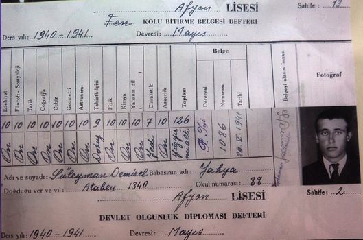 Okulun 88 numaralı öğrencisi Demirel'in, edebiyat, sosyoloji, tarih, coğrafya, cebir, geometri, astronomi, fizik, kimya, yabancı dil ve askerlik derslerinden 10, tabiat bilgisinden 9, jimnastikten ise 7 alarak mezun olduğu görülüyor.