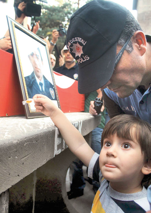 Hakkâri ve Mardin’de şehit düşen 5 polis memuru için tören düzenlendi. Kayseri’de, şehit babası Oktay İzgi’nin fotoğrafını gösterip “Bu babam” diyen 3 yaşındaki Eymen, törene katılanları ağlattı.