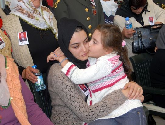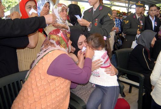 Tören sırasında şehit askerin kızı, sık sık annesini öperek teselli etmeye çalıştı.