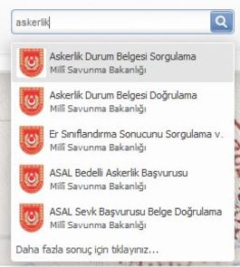 ASKERLİK DURUM BELGESİ ÖĞRENMETıkladığınız bu alana aşağıdaki resimde gösterildiği gibi "Askerlik" yazmanızın ardından, görüldüğü üzere ilk sırada çıkan "Askerlik Durum Belgesi Sorgulama" bölümünün üzerine tıklanmalıdır.