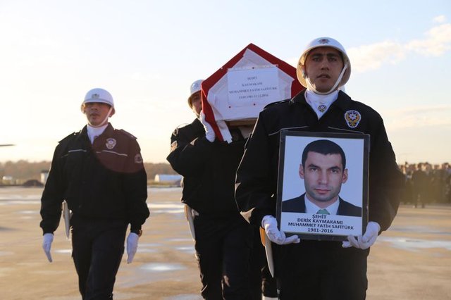 Şehit Kaymakamın cenazesi dua ve tekbirlerle defnedildi. Erdoğan, şehit kaymakamın defnedilmesinin ardından mezarlıktan ayrıldı.