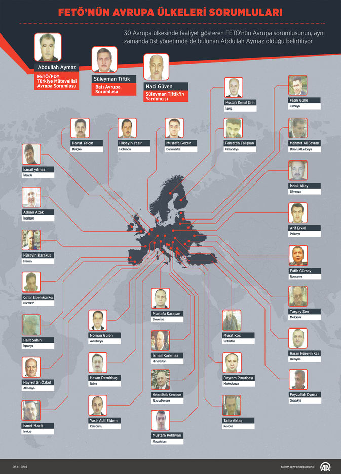 30 Avrupa ülkesinde faaliyet gösteren FETÖ'nün Almanya sorumlusunun Hayrettin Özkul, İngiltere sorumlusunun Adnan Azak, Fransa sorumlusunun Hüseyin Karakuş, Belçika sorumlusunun Davut Yalçın olduğu kaydedildi.