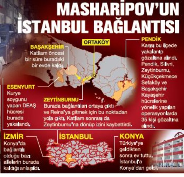 Reina'da 39 kişiyi katleden DEAŞ'lı terörist Abdulkadir Masharipov'u yakalamak için operasyonlar düzenleyen polis, birçok ilçede teröristle bağlantılı 8 hücreyi çökertip 35 kişiyi gözaltına aldı.