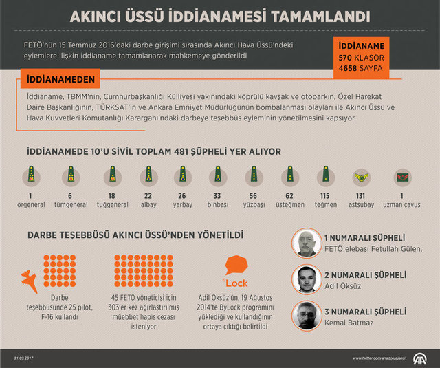 Fetullahçı Terör Örgütü'nün (FETÖ) darbe girişimine ilişkin Akıncı Üssü'ndeki eylemlerle ilgili iddianamede, darbe günü yaşananların başlangıcı olarak, Kara Havacılık Komutanlığında görevli bir subayın Milli İstihbarat Teşkilatına (MİT) gidip FETÖ'cülerin MİT Müsteşarı Hakan Fidan'ı almak için kuruma saldırı yapılacağı ihbarında bulunduğu 16.16 saati baz alındı.
