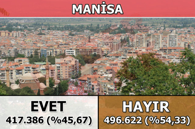 Manisa'da 1 Kasım 2015 seçimlerinde yüzde 36,1 oy alan "Hayır Cephesi", halk oylamasında kesin olmayan sonuçlara göre yüzde 54,33 ile seçmenin tercih ettiği taraf oldu