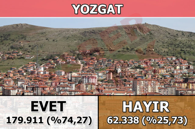Yozgat'ta 1 Kasım 2015 seçimlerinde yüzde 77,91 oy alan "Evet Cephesi", halk oylamasında da yüzde 74,27 ile seçmenin tercih ettiği taraf oldu