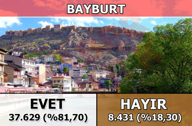 Bayburt'ta 1 Kasım 2015 seçimlerinde yüzde 94,4 oy alan "Evet Cephesi" (AK Parti, MHP, BBP), halk oylamasında da yüzde 81,70 ile seçmenin tercih ettiği taraf oldu