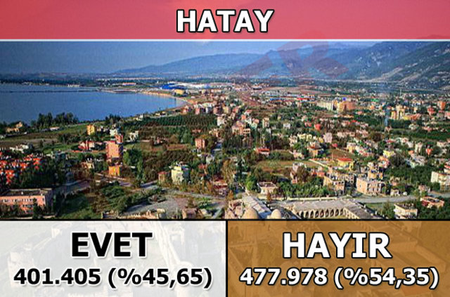 Hatay'da 1 Kasım 2015 seçimlerinde yüzde 44 oy alan "Hayır Cephesi", halk oylamasında da resmi olmayan sonuçlara göre yüzde 54,35 oy aldı