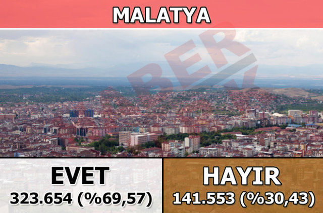 Malatya'da 1 Kasım 2015 seçimlerinde yüzde 77,62 oy alan "Evet Cephesi", halk oylamasında da yüzde 69,57 ile seçmenin tercih ettiği taraf oldu