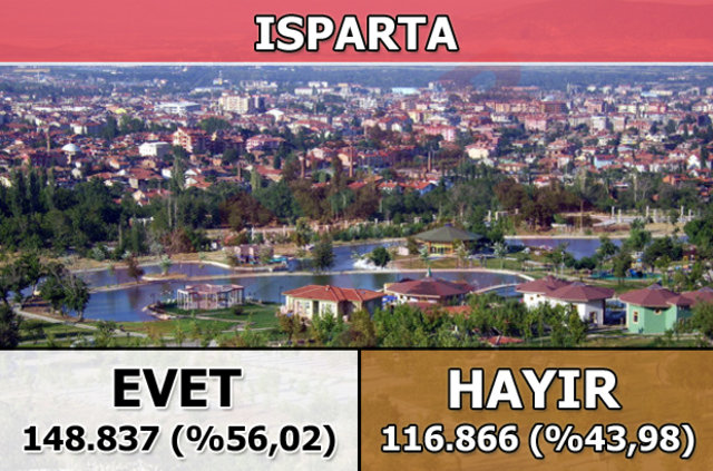 Isparta'da 1 Kasım 2015 seçimlerinde yüzde 75,02 oy alan "Evet Cephesi", halk oylamasında resmi olmayan sonuçlara göre, yüzde 56,02 ile seçmenin tercih ettiği taraf oldu