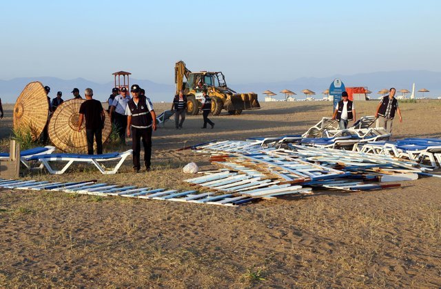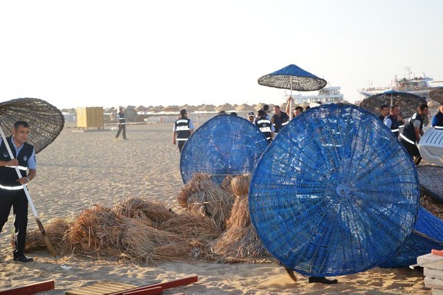 Alanları dışına taşan yüzlerce şemsiye, şezlong, kamelya ve çevre çitleri, ekipler tarafından toplandı. - 7