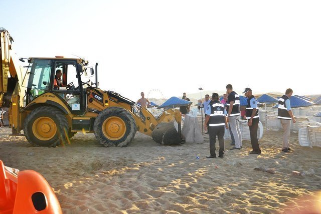 Plajdaki işletmelerin sınırları, yetkililer tarafından belirlendi ve sınırlara iş makineleriyle getirilen beton bloklar yerleştirildi.